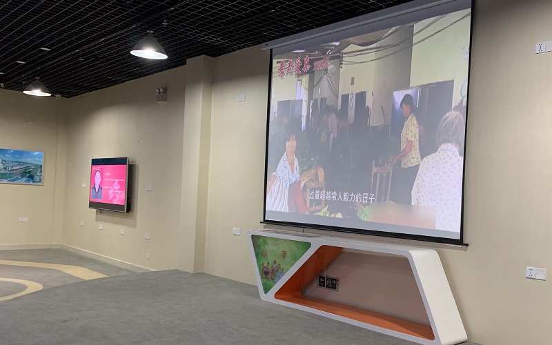 2. 項目背景:展館內(nèi)設(shè)置包含投影儀融合屏、電視機、觸摸一體機、投影屏幕等的10余臺顯示設(shè)備,用于展示武平縣概況及好人館的建設(shè)意義、助人為樂等等個人事跡的宣傳視頻、圖片和問卷調(diào)查及簽名留言的網(wǎng)頁、應(yīng)用程序等節(jié)目類型。