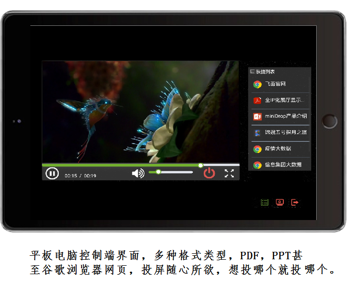 miniDrop 和smartDrop 是飛畫(huà)公司針對(duì)單屏幕單畫(huà)面拼接屏或小間距LED/LCD大屏專門(mén)推出的產(chǎn)品。 支持投屏內(nèi)容管理,屏幕任意拼接預(yù)制場(chǎng)景輪訓(xùn),實(shí)時(shí)回顯,交互操作等功能。以下示例為視頻,請(qǐng)單擊視頻畫(huà)面即可播放。